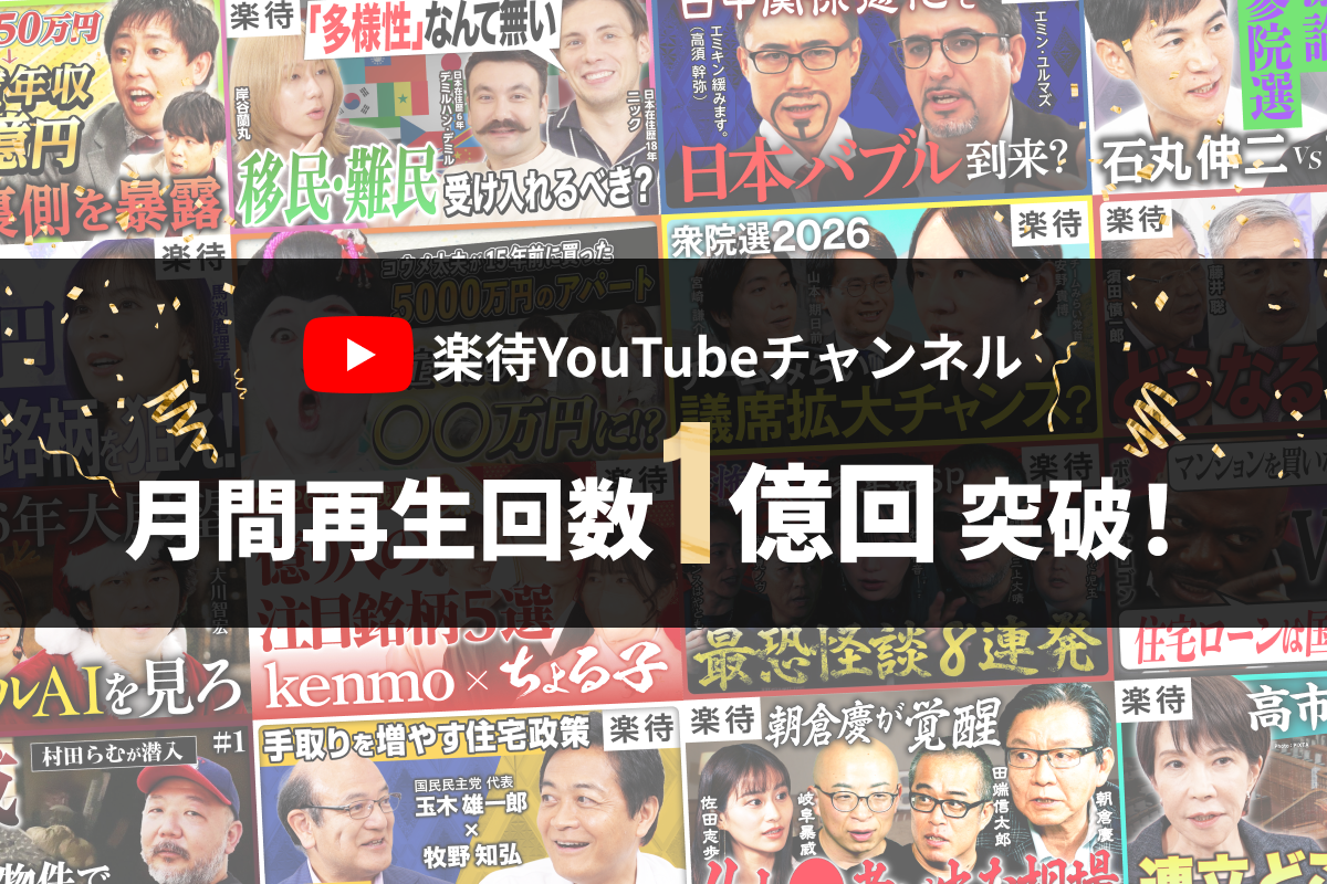 ホーム   >  プレスリリース   >  YouTubeチャンネル「楽待 RAKUMACHI」2026年1月の月間再生回数が1億回を突破!